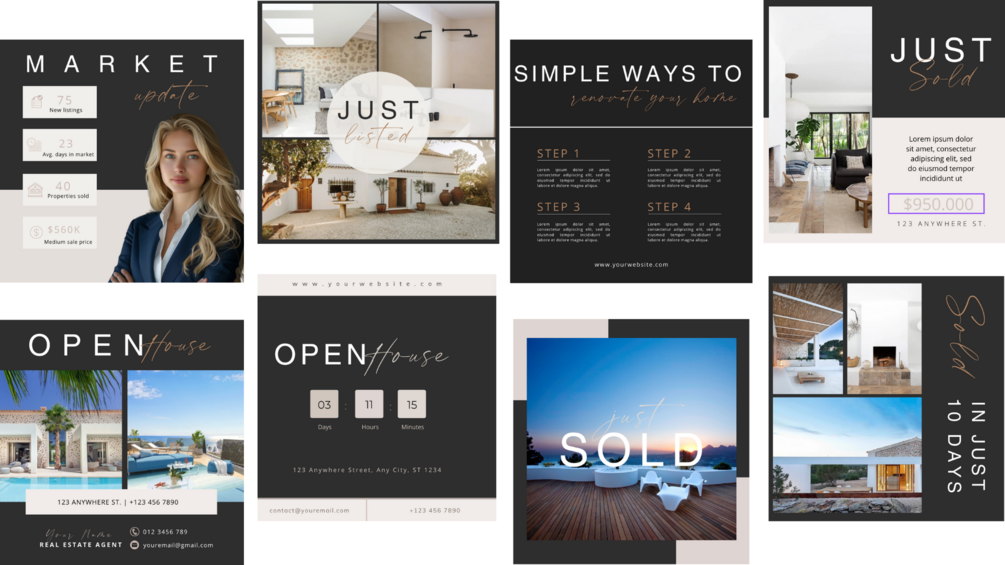 - Diverse Templates: From property showcases to market updates, open house announcements to client testimonials, our package offers a wide range of templates to cover all your social media needs.